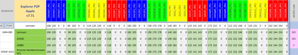 Just as an initial confirmation of the basics, I have pasted the 1949-083 row from Matt’s original source file “DNA Apple UK NFC – SSR all data for supply 14_10_10.xlsx” back into the target line of Explorer and it is exactly consistent (as I would hope !) and INRAE gave it MUNQ 885 for which there are no records other than these four shown here. INRAE preferred name is Lemoen. The CRAW-1015 is also MUNQ 885 but was derived from our Explorer translator from the reference 17-SSR fingerprint so hasn’t (yet) picked up the MUNQ 885 but I have shown the MUNQ entries below